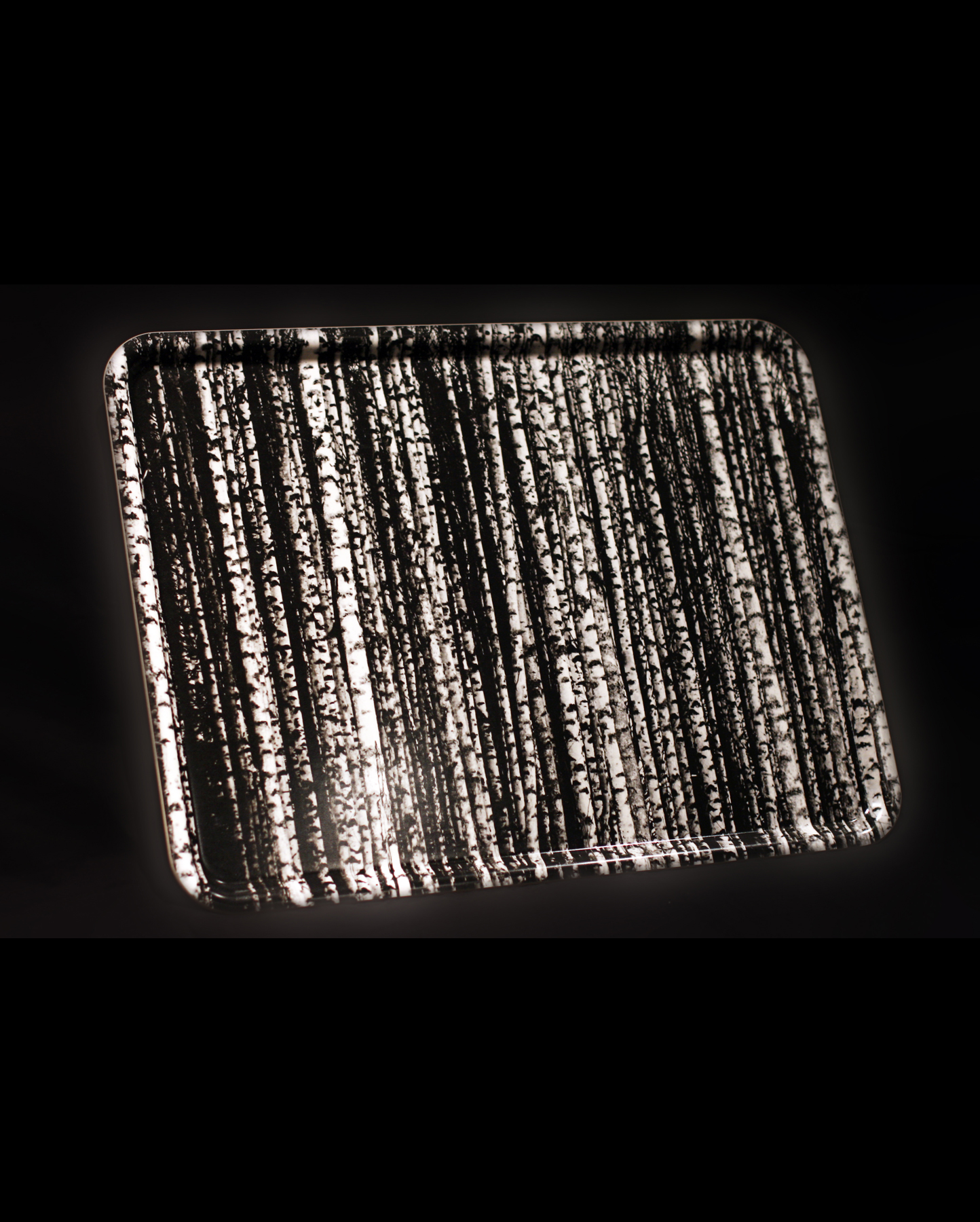 Tyylikäs mustavalkoinen graafinen koivumetsä. Tarjotin on valmistettu ohuesta koivuviilusta muotoon puristamalla. Isokokoisella tarjottimella on helppo kuljettaa isompiakin määriä astioita ja laseja kerralla. Sopii kovaan käyttöön tai kauniiksi sisustuselementiksi. Mustavalkoinen graafinen koivumetsä.