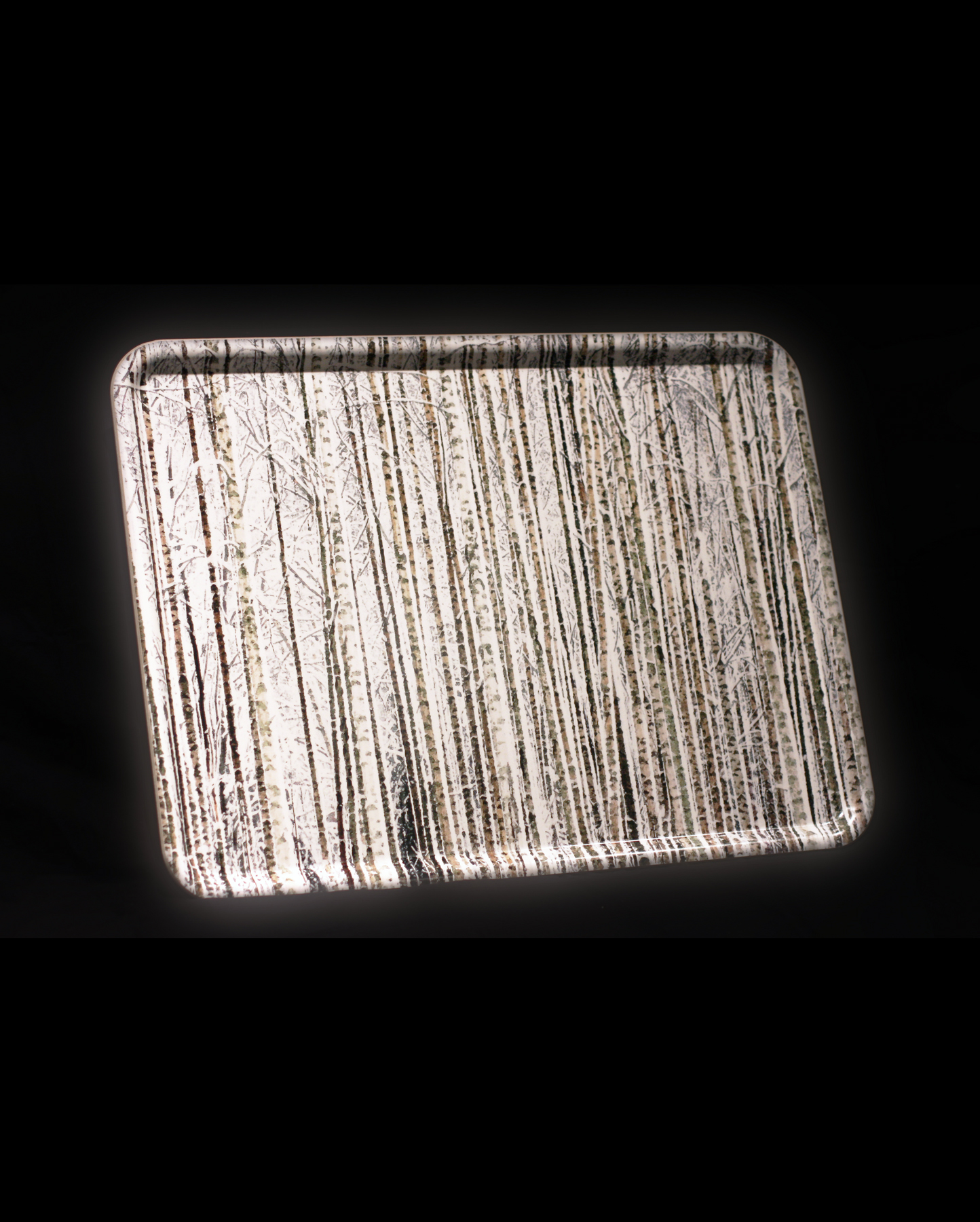 Tyylikäs mustavalkoinen graafinen koivumetsä. Tarjotin on valmistettu ohuesta koivuviilusta muotoon puristamalla.